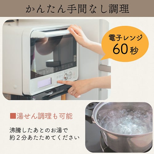 【湯煎の場合】袋のまま、沸騰したあとのお湯で2分間温めてください。お好みにより加減してください。